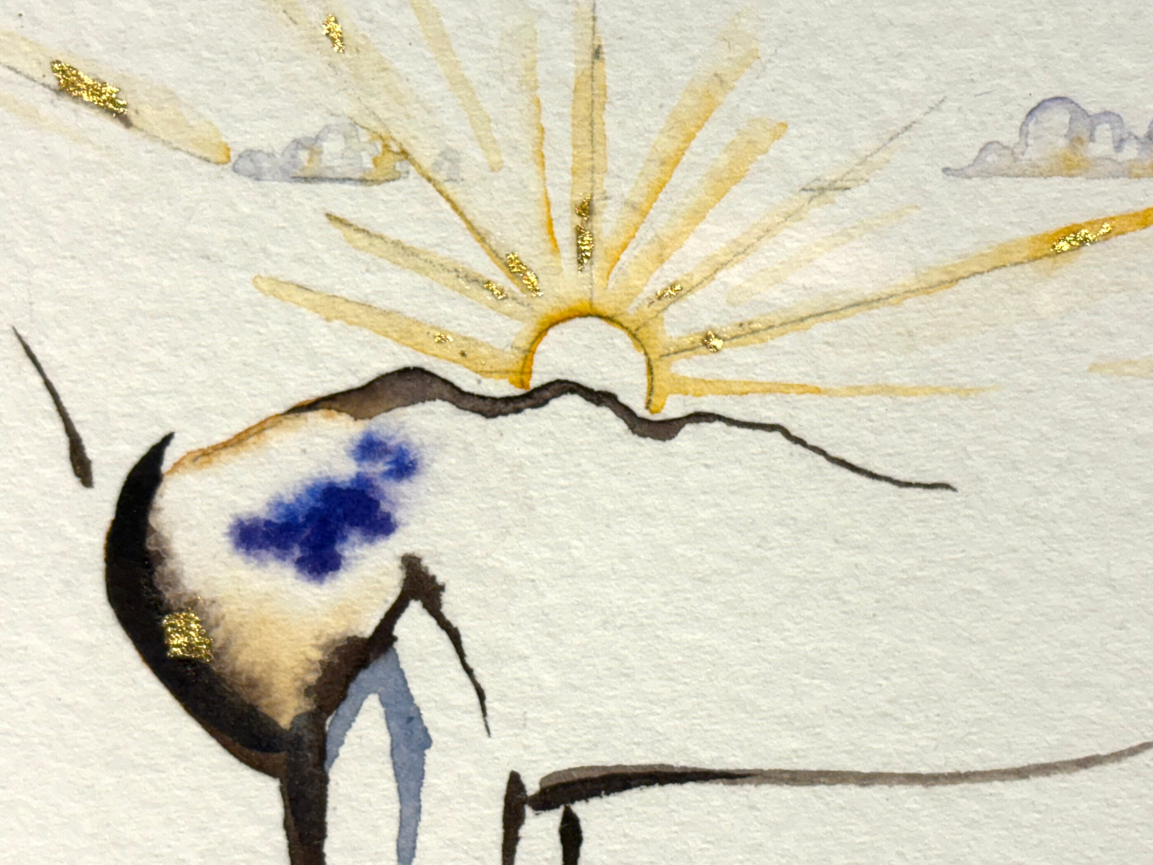Original watercolor painting with 23K gold leaf created by Sarah Richards. The size mentioned in the title refers to the outside frame edge dimensions. Mat colors and/or frame styles can be changed for little or no up-charge. Item is fully framed and will be shipped with full insurance. Any question please call/text us at 207.592.4036.