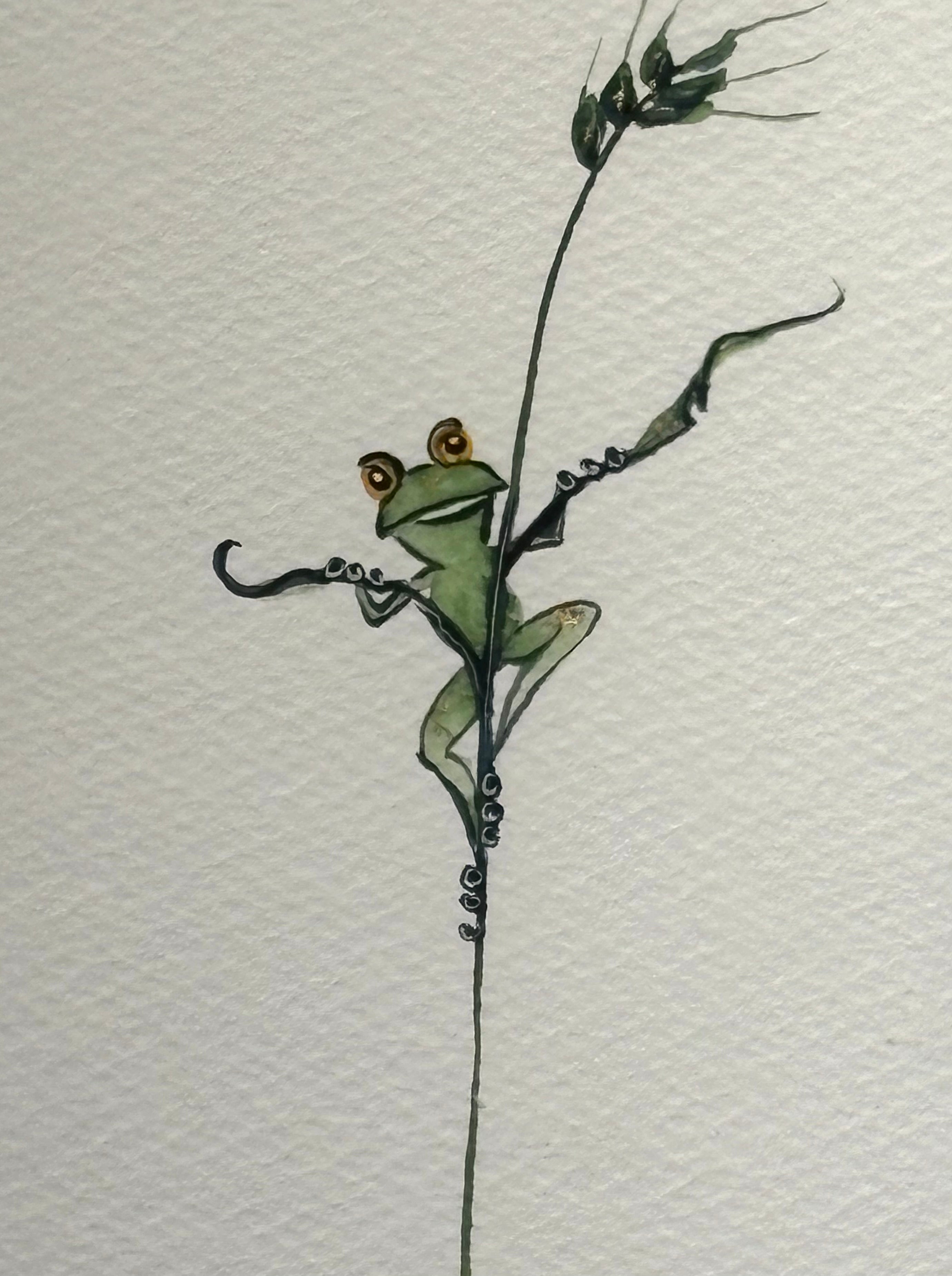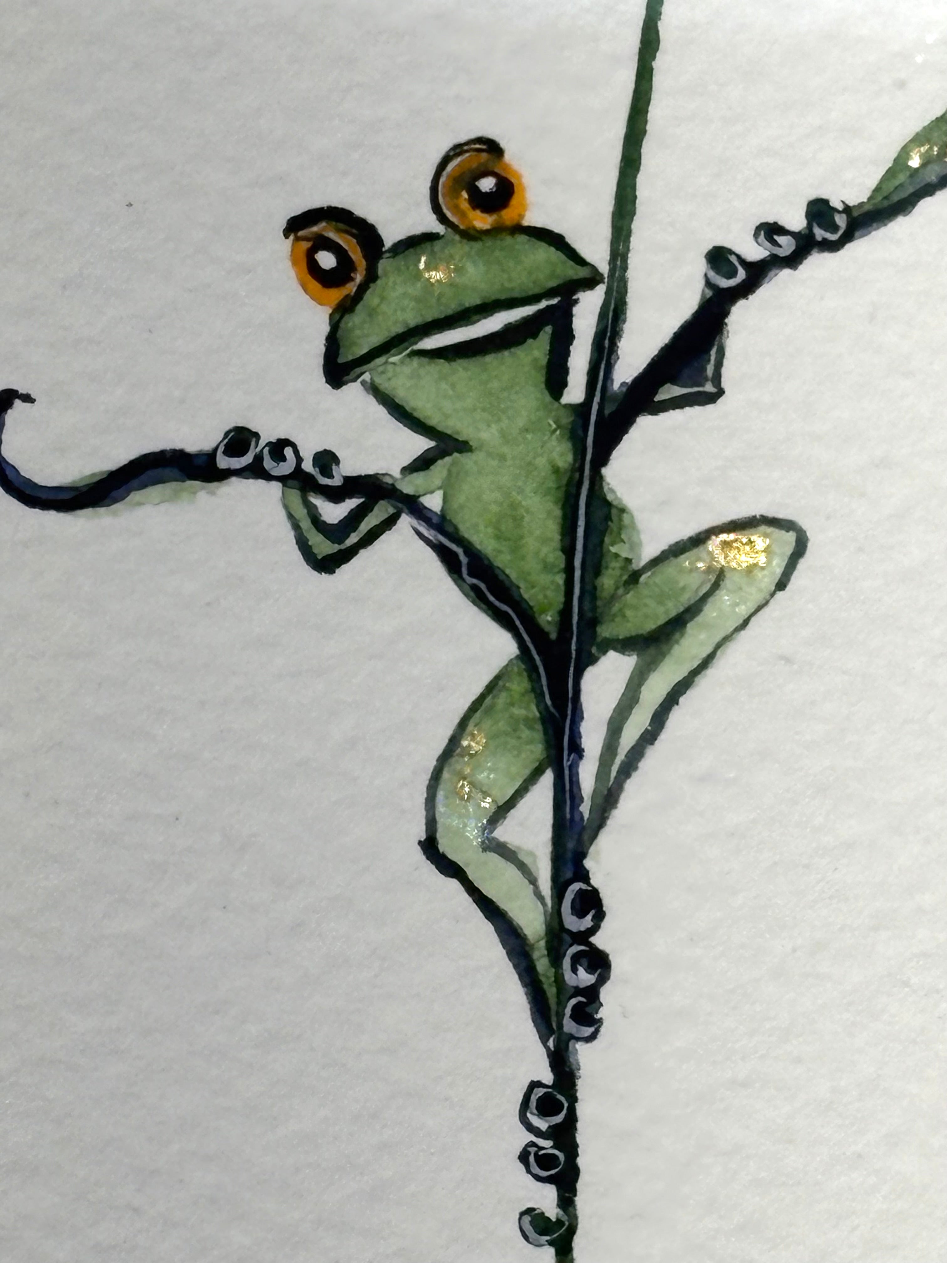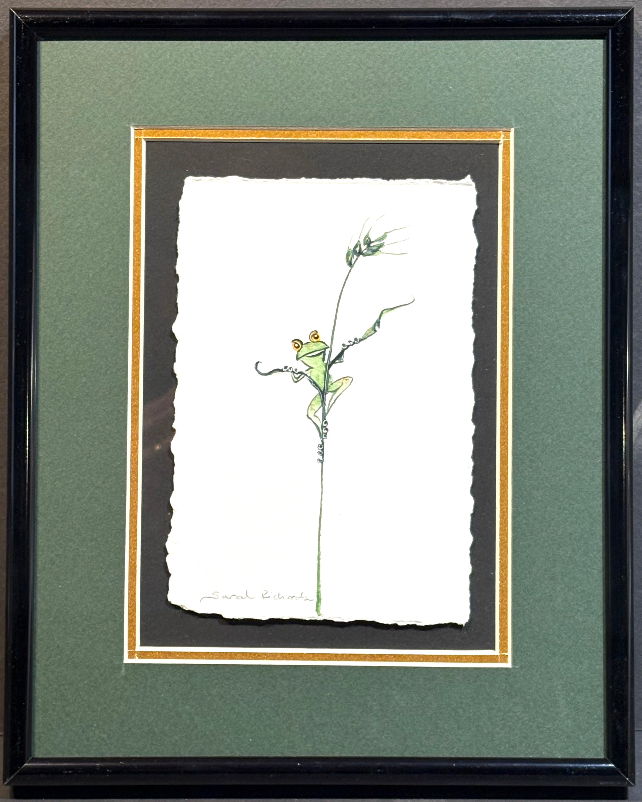 Tiny Frog on grass with 23K gold leaf framed to approx 9x11, $195