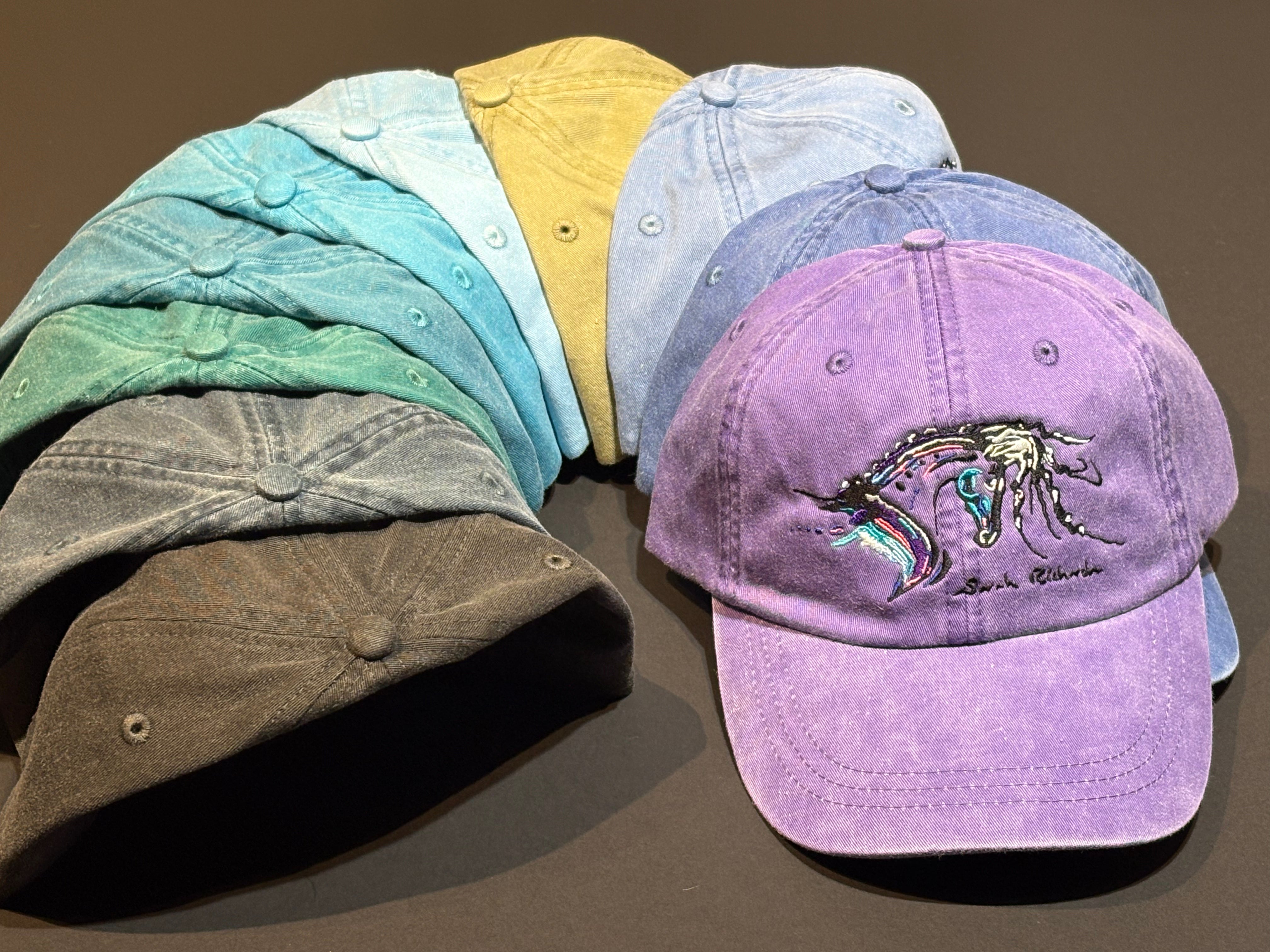 Sarah's wonderful artwork of a Spanish Horse embroidered on 100% soft cotton high quality Adams caps. Each features adjustable leather strap with buckle.